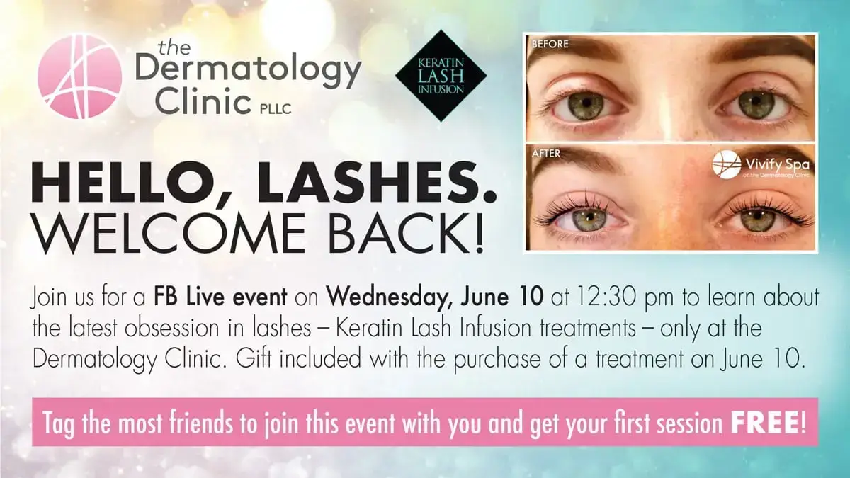 Join us for a FB Live event on Wednesday, June 10 at 12:30 pm to learn about the latest obsession in lashes – Keratin Lash Infusion treatments – only at the Dermatology Clinic. Gift included with the purchase of a treatment on June 10.