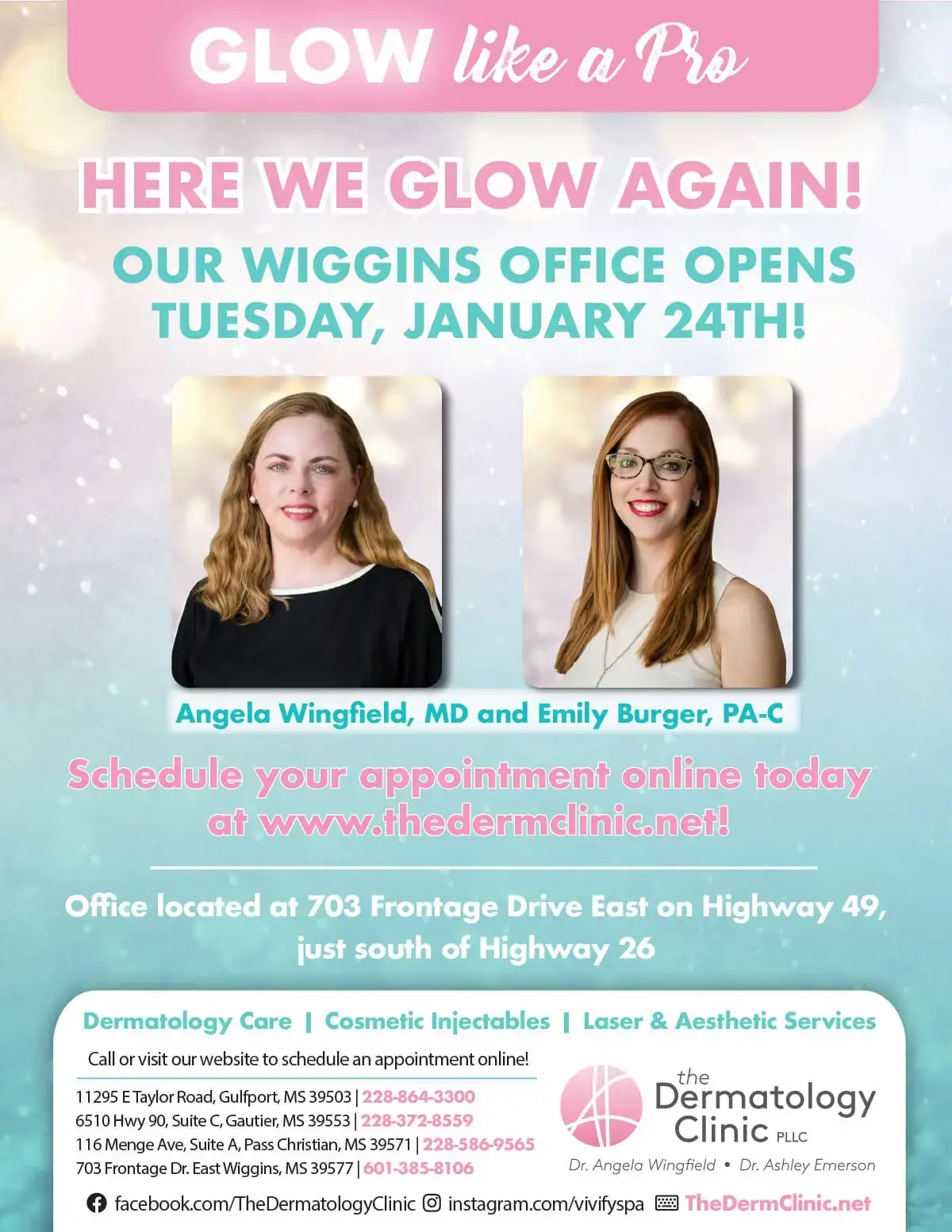 READY, SET, GLOW – The Dermatology Clinic is pleased to announce that their fourth dermatology clinic in Wiggins, MS is now open on Highway 49 Frontage Drive East, just south of Highway 26. The new office opened to the public on Tuesday, January 24, 2023, and the clinic offers medical, surgical and cosmetic procedures for patients of all ages. Dr. Angela Wingfield is continually bringing cutting edge medical and cosmetic dermatology services to the coast. She is excited to serve the Wiggins community and bring more access to expert dermatology care across the Mississippi Gulf Coast.